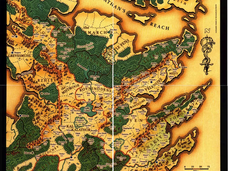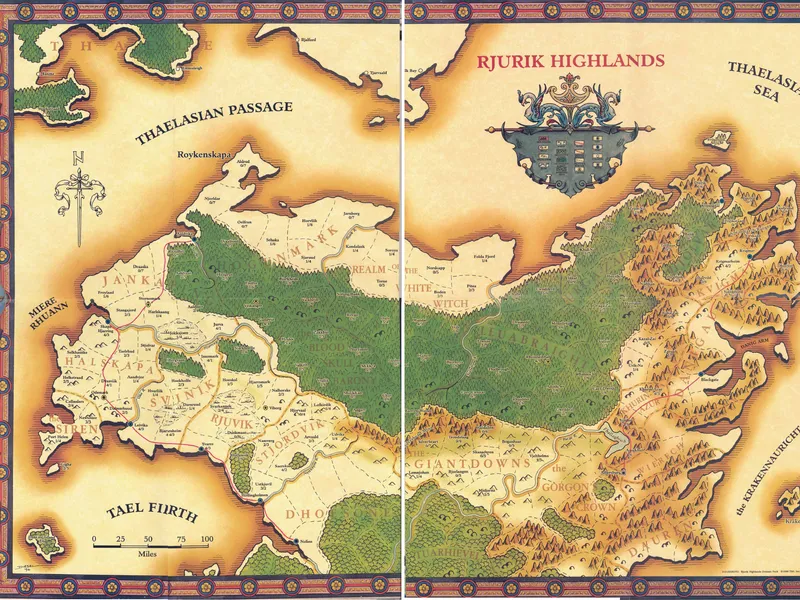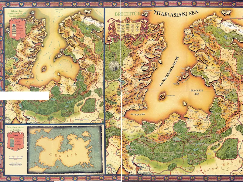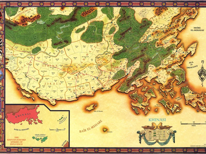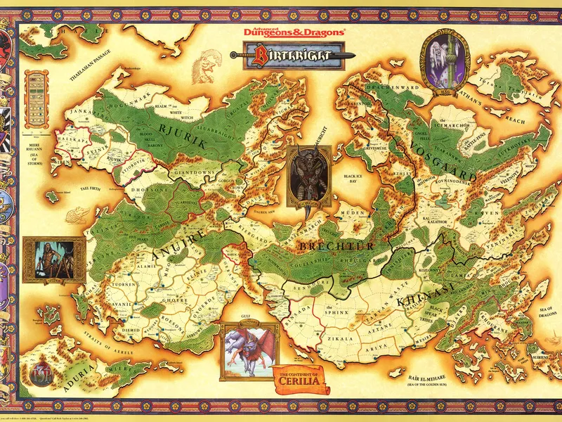 The world of Aebrynis has at least four known continents, the frozen continent of Thaele, the continent of Djapar to the southeast, the great southern continent of Aduria, and Cerilia, the location of the actual Birthright campaign. Cerilia itself is divided into five regions: Anuire, Rjurik, Brechtür, Khinasi, and Vosgaard, each named after the primary human group that first settled there.