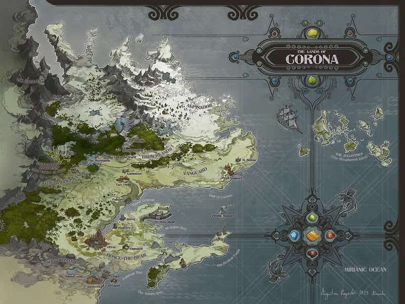 Corona bears more than a passing resemblance to Eastern Canada, sharing similar river systems and landmass geography. The setting has been made available for gaming through a series of sourcebooks released for the d20 OGL 3.5 Version as well as a later entire game system.