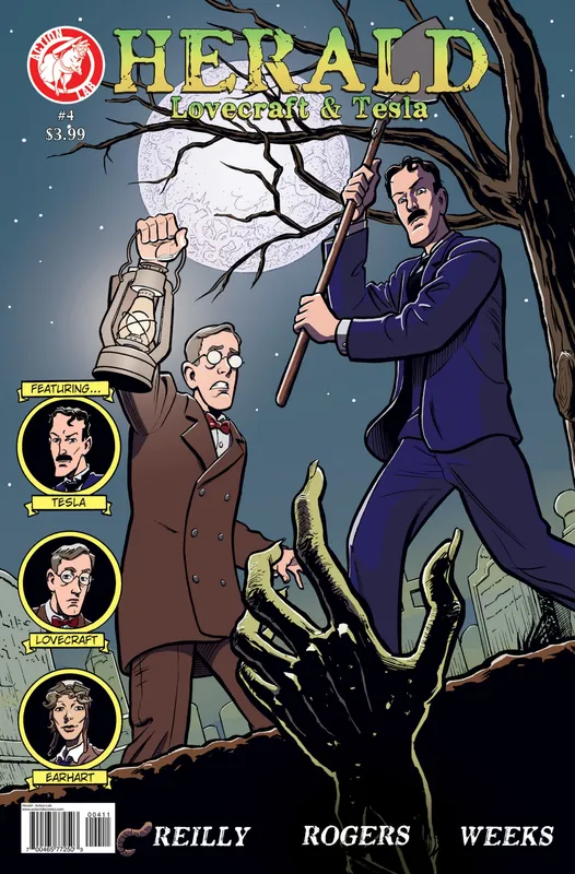 While Earhart fights her way through the Elsewhere dimension, Lovecraft and Tesla spend an evening graverobbing before attending Mark Twain’s retirement party. The critically acclaimed Action Lab series continues!