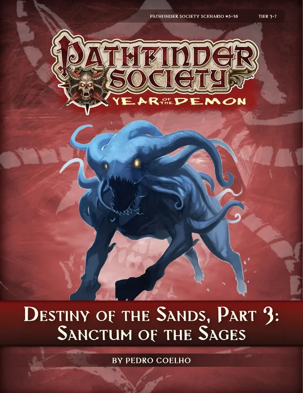 “Sanctum of the Sages” is the final scenario in the three-part Destiny of the Sands campaign arc. It follows Pathfinder Society Scenario #5–12: Destiny of the Sands—Part 1: "A Bitter Bargain" and Pathfinder Society Scenario #5–15: Destiny of the Sands—Part 2: "Race to Seeker’s Folly." All three chapters are intended to be played in order.