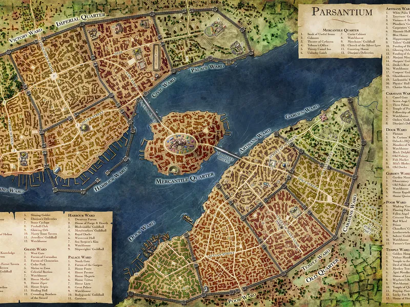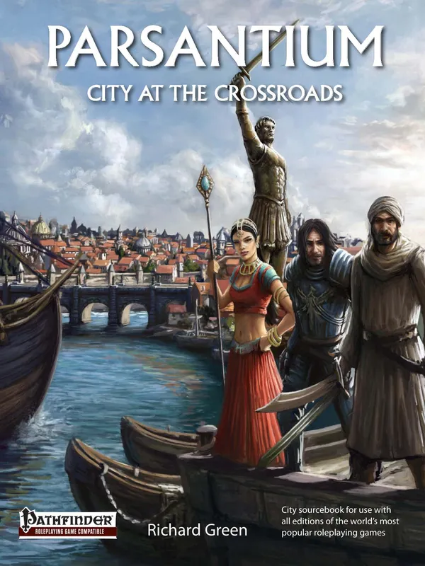 Parsantium is above all else a trading city, where merchants come from all over the known world to sell their goods for the highest price possible, and to buy whatever is in demand back home. As well as exporting goods that have arrived in the city from elsewhere, Parsantium produces a number of sought-after commodities itself, including beer, wine, olives, fine clothing and metalwork, weapons and armour, jewellery, religious icons and rare woods. The purple dye made in the city from local shellfish is also much in demand by wealthy nobles overseas, but its export is restricted since purple should only be worn by the Basileus and his most important vassals.