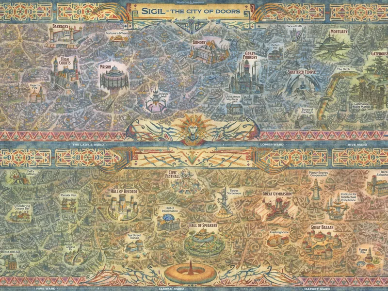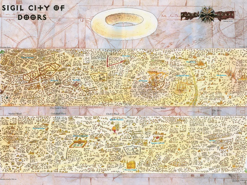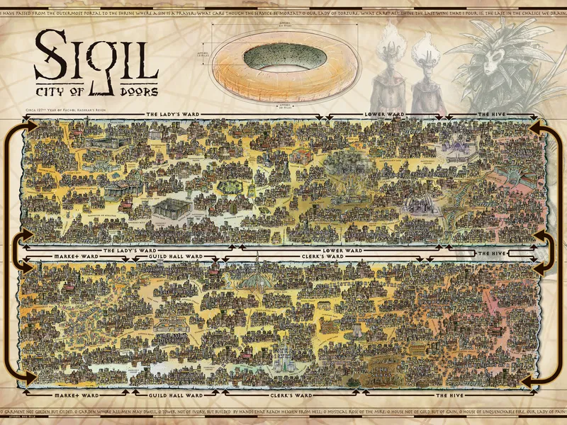 The game is set in Sigil, the "City of Doors", a torus shaped city/world that rests atop the Spire. There is no sky, simply an all-pervasive light that waxes and wanes to create day and night. Sigil cannot be entered or exited save via portals. Thus, many call Sigil "The Bird Cage" or "The Cage." There are fifteen philosophy-derived factions. Each of these factions is based on one particular belief system; one faction's beliefs make them enemies while others make them allies.