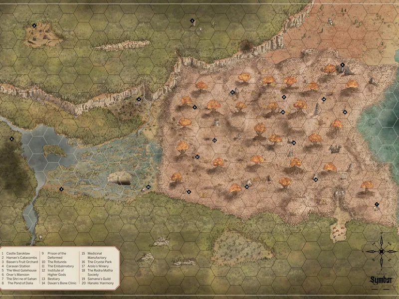 Symbaroum has several well-developed areas. The vast Forest of Davokar is full of treasure, lost ruins, and strange opponents - and often is the locale for new adventurers starting their careers. The nearby capital city of Yndaros often severs as a base of operations.