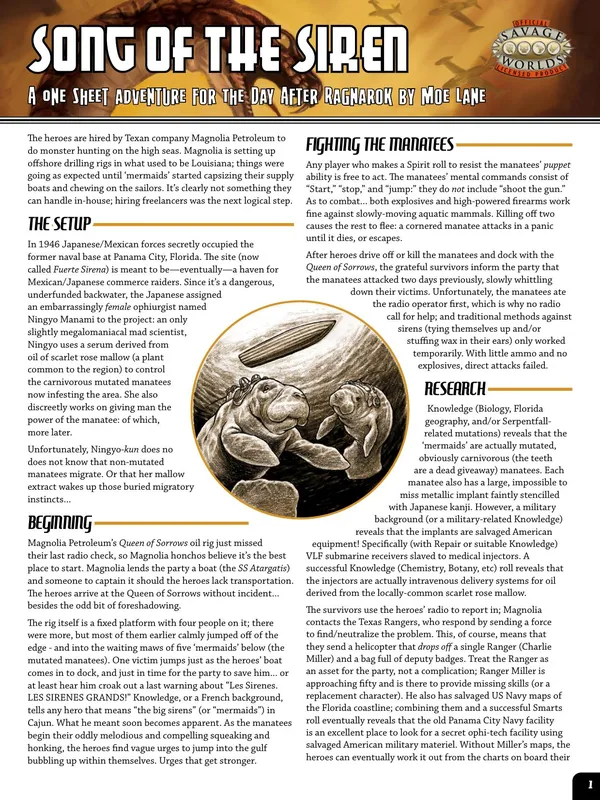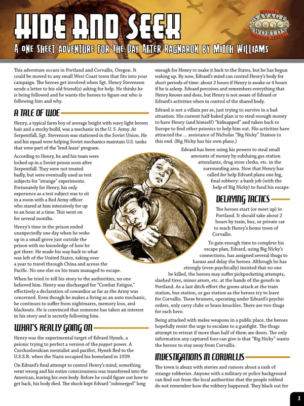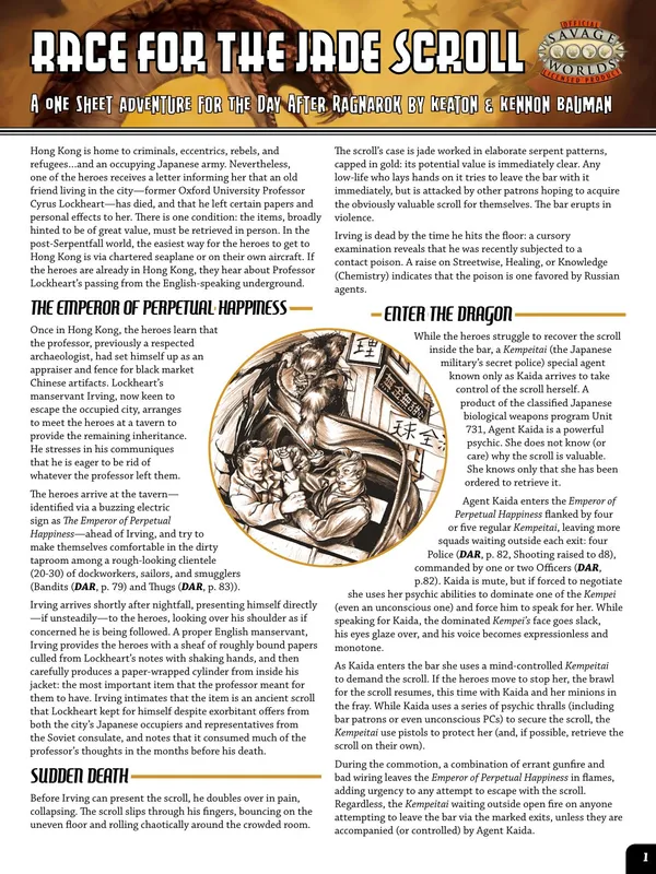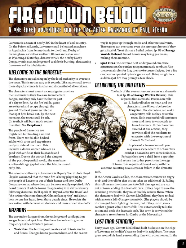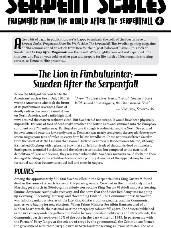 The Day after Ragnarok is a setting released initially for Savage Worlds, and has subsequently also released in a version for Hero System Sixth Edition. The concept has been described by the creator as "Conan 1948".