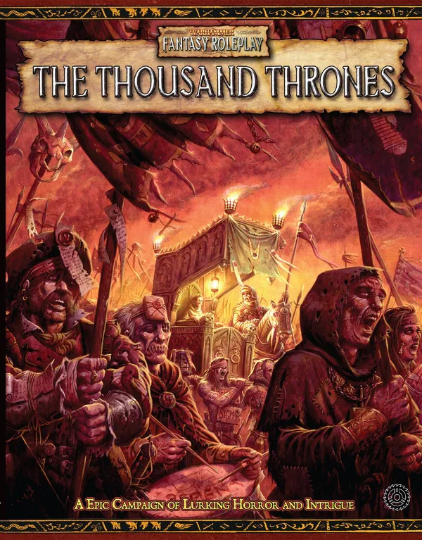 The Thousand Thrones is a campaign for Warhammer Fantasy Roleplay, promising to take adventurers from the stinking canals of Marienburg to the western fringes of Kislev. When a boy with a burning twin-tailed comet on his chest single-handedly kills a pair of cultists, he is proclaimed to be Sigmar reborn. Supported by a legion of fanatical followers, the player characters are drawn into a dangerous and sinister story involving ancient evil, the cults of Chaos, the lords of night and a veritable army of other deadly foes.