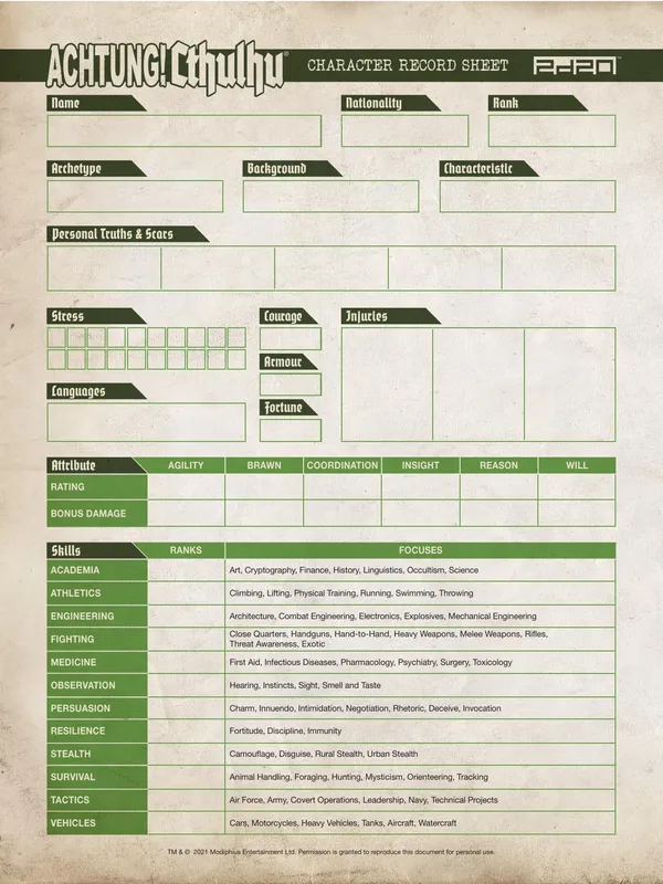 Achtung! Cthulhu is a setting for Lovecraftian roleplaying during World War II, which allows players to discover the truth behind the malign influence of the Mythos on the Nazi war machine and beyond, as conflict engulfs the globe during 1939-1945.