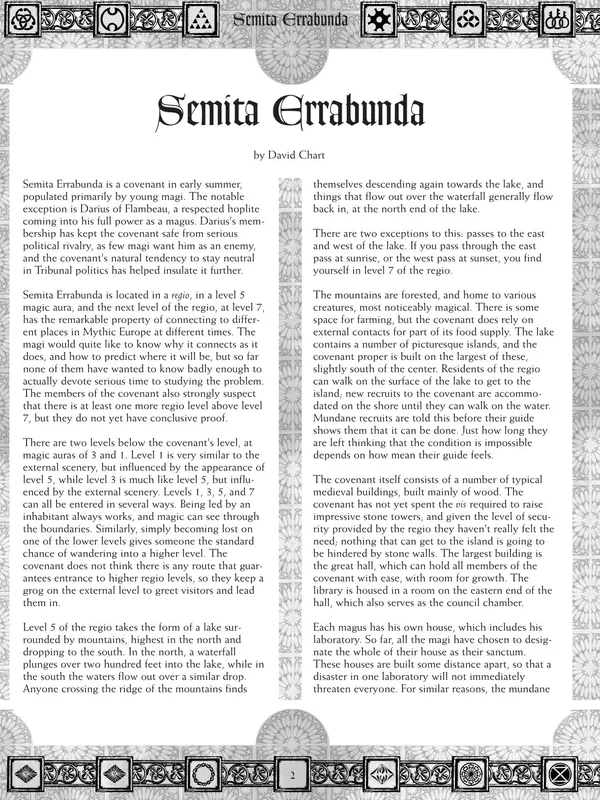 Imagine an age where myth is real and where the superstitions of the common folk hold true: faeries dance in forest glades, angels protect the Church, demons corrupt the weak, and wizards wield magic beyond the ken of other mortals. You play these magi, gathered in covenants with your allies and servants, unlocking secret powers and creating wonders. You and your friends will also portray the loyal companions and grogs who stand with the magi, as a buffer between them and the mundane world that often misunderstands their power and motives. When adventures draw you out into the medieval world of Mythic Europe, your stories are the stuff of legend.