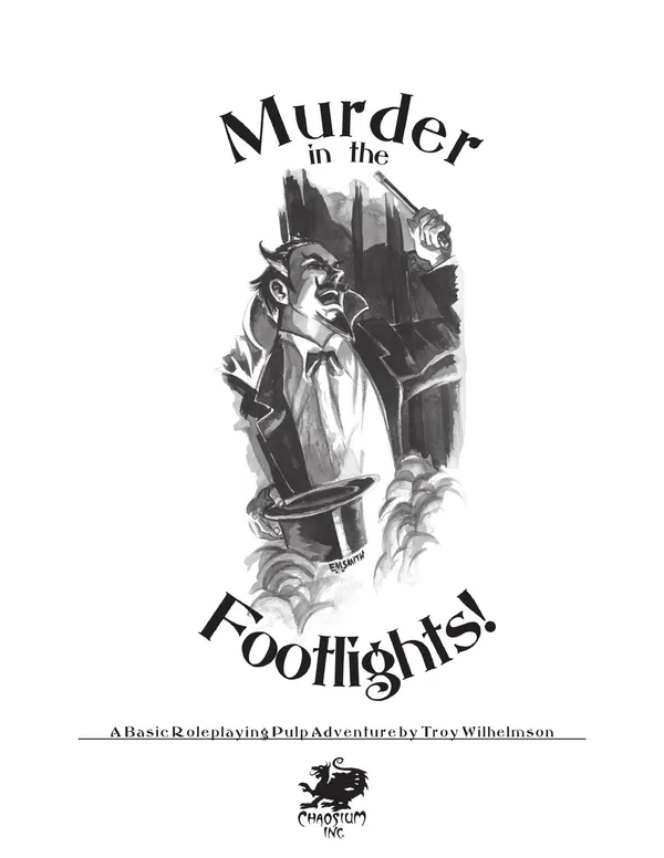 Murder in the Footlights is a short Pulp Basic Roleplaying adventure suitable for two to four adventurers of normal to heroic experience. Character types that are suitable for the adventure would be Detectives, Reporters, Photographers, wealthy Dilettantes with connections in big city politics, or even a low-powered Pulp Age Super Hero. Other character types can work just as well, but it will be up to the gamemaster to determine how the adventurers get caught up in this caper.