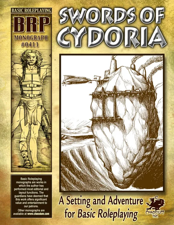 Welcome to the Swords of Cydoria, a setting for Basic Roleplaying. Swords of Cydoria is set on the fantasy world of Uruta. Whether Uruta is our own Earth in the far future, a mirror of Earth in a parallel universe, or a strangely-familiar alien world on the far side of the galaxy is unclear. Uruta is a savage barbaric world of flashing swords, mutant beasts, daring heroes, diabolical cults, ancient ruins, mysterious forces, and powerful artifacts. Against this backdrop of swords and sorcery is told a story of contact with alien worlds, the introduction of science-fiction technology, and the struggle for freedom against oppression.