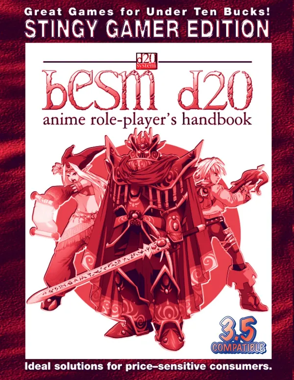 Updated for 3.5! Introducing the Stingy Gamer Edition of the best in d20 System anime role-playing, BESM d20! A complete game for under $10! BESM d20 is inspired by the dynamic settings and stories found in a wide range of anime shows, allowing players to create characters from any genre or sub-genre. Comedy or horror, fantasy or science-fiction, mecha action or passionate romance...if you can image it, you can play it. BESM d20 also includes: new character classes (including magical girl, mecha pilot, pet monster trainer, and a dozen more), new skills, new feats, an exhaustive point-based attribute list, and a detailed cost assignment for the core 3.5 Edition fantasy races and classes. Everything you've always wanted from your fantasy RPG -- and more! An ideal solution for price-sensitive consumers.