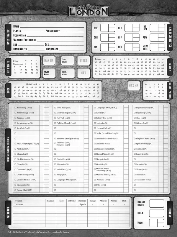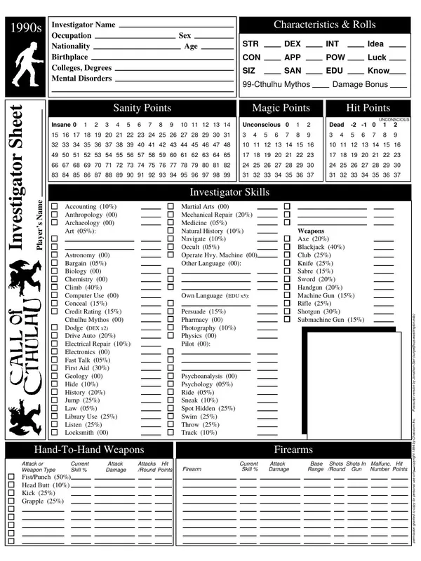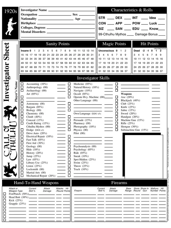 Call of Cthulhu is a horror roleplaying game using the Basic Roleplaying system and based upon the writings of Howard Phillips Lovecraft and a few others. Lovecraft wrote during the 1920s and 1930s, and he became a cult figure before dying in 1937. Since then his stature as an author has grown, and now he is generally recognized as the major American horror-story writer of the twentieth century.