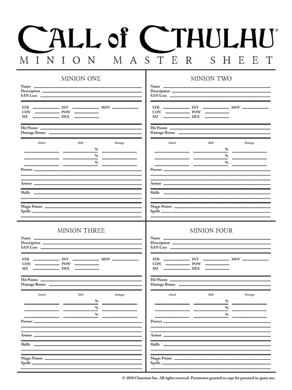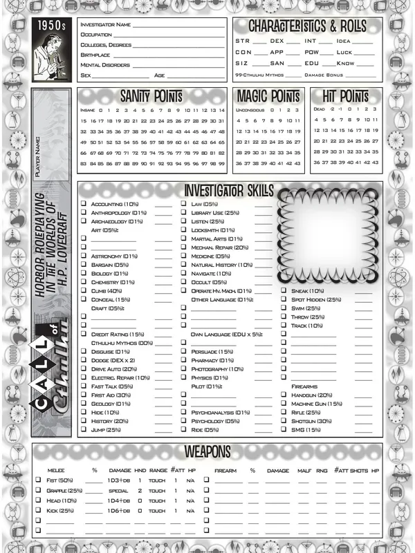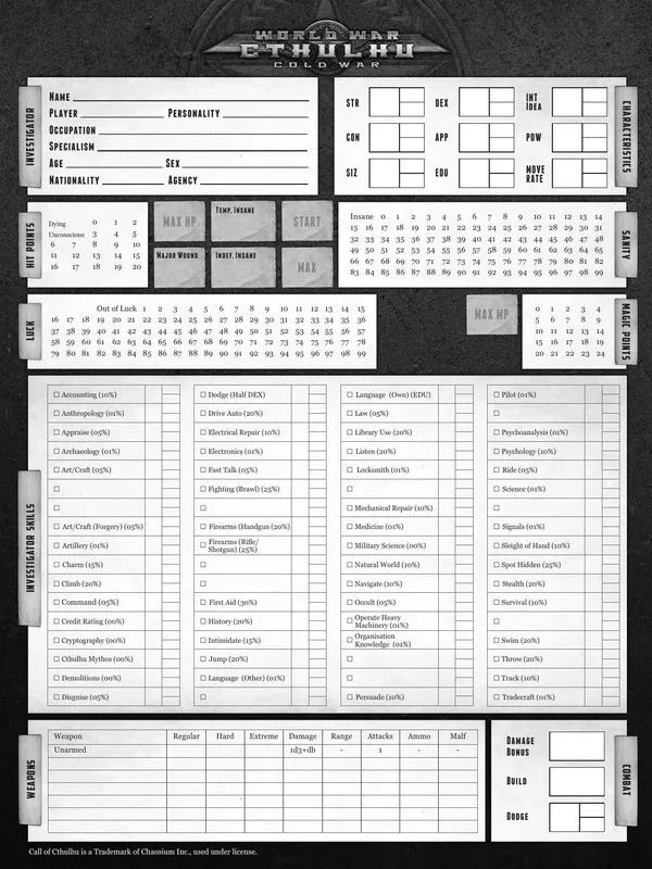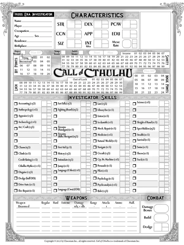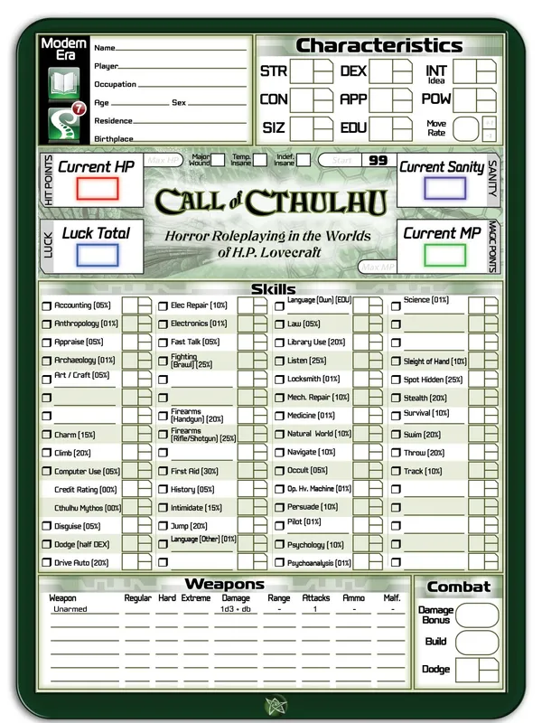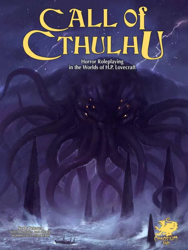 Call of Cthulhu is a tabletop roleplaying game based upon the worlds of H. P. Lovecraft. It is a game of secrets, mysteries, and horror. Playing the role of steadfast investigators, you travel to strange and dangerous places, uncover foul plots, and stand against the terrors of the Cthulhu Mythos. You encounter sanity-blasting entities, monsters, and insane cultists. Within strange and forgotten tomes of lore you discover revelations that man was not meant to know. You and your companions may very well decide the fate of the world.