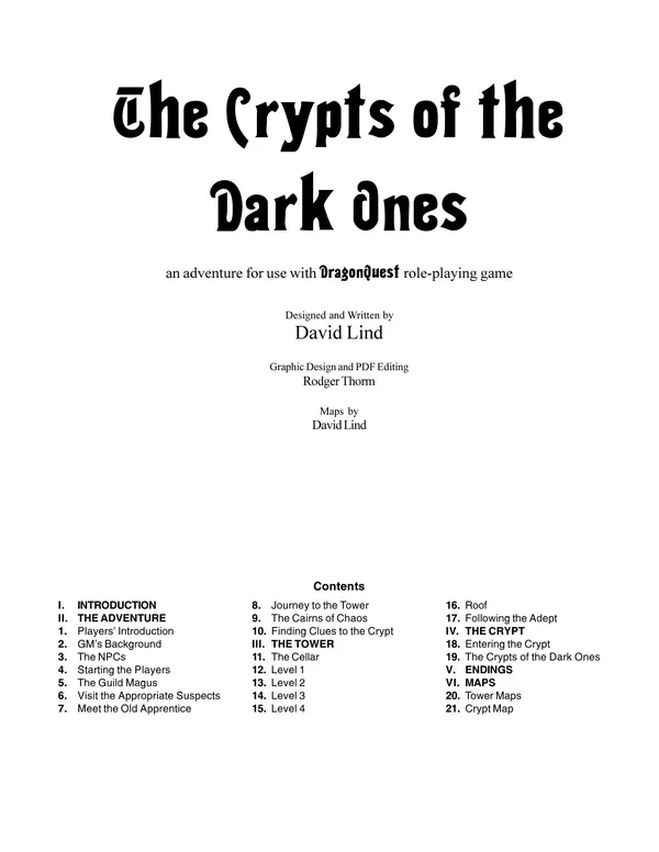 Perhaps the first fan-created DragonQuest adventure available online The Crypt of the Dark Ones, is intended for five to eight characters of combined mercenary and adventurer level.