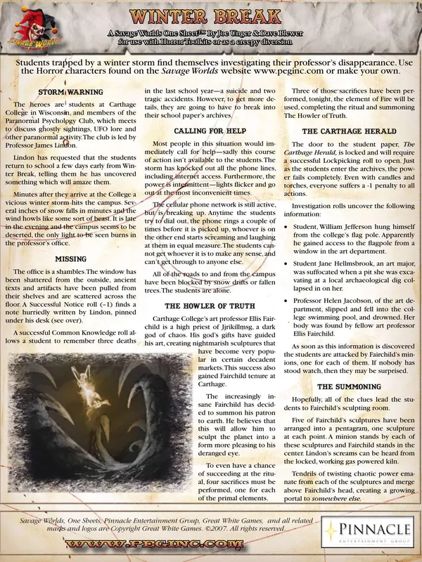 Savage Worlds has everything you need to play narrative or miniature-based games, with quick, simple, yet comprehensive rules for everything from combat to Dramatic Tasks, Chases, and Interludes. The emphasis is on less bookkeeping for the Game Master so she can quickly and easily create worlds and adventures for any setting and focus on the players and their actions to keep the action and story rocketing along.