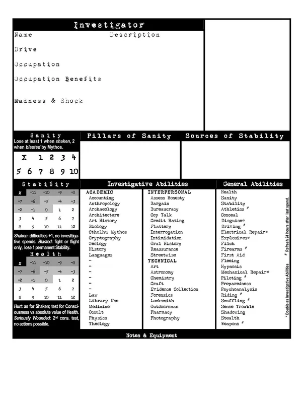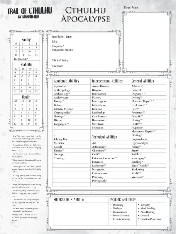 Trail of Cthulhu is a complete game of investigative horror set in the 1930s based on the work of HP Lovecraft. The game uses an adpated and enlarged version of GUMSHOE system which offers a laser-like focus on investigation, with characters driven to explore and investigate, even at the expense of their own health and sanity.